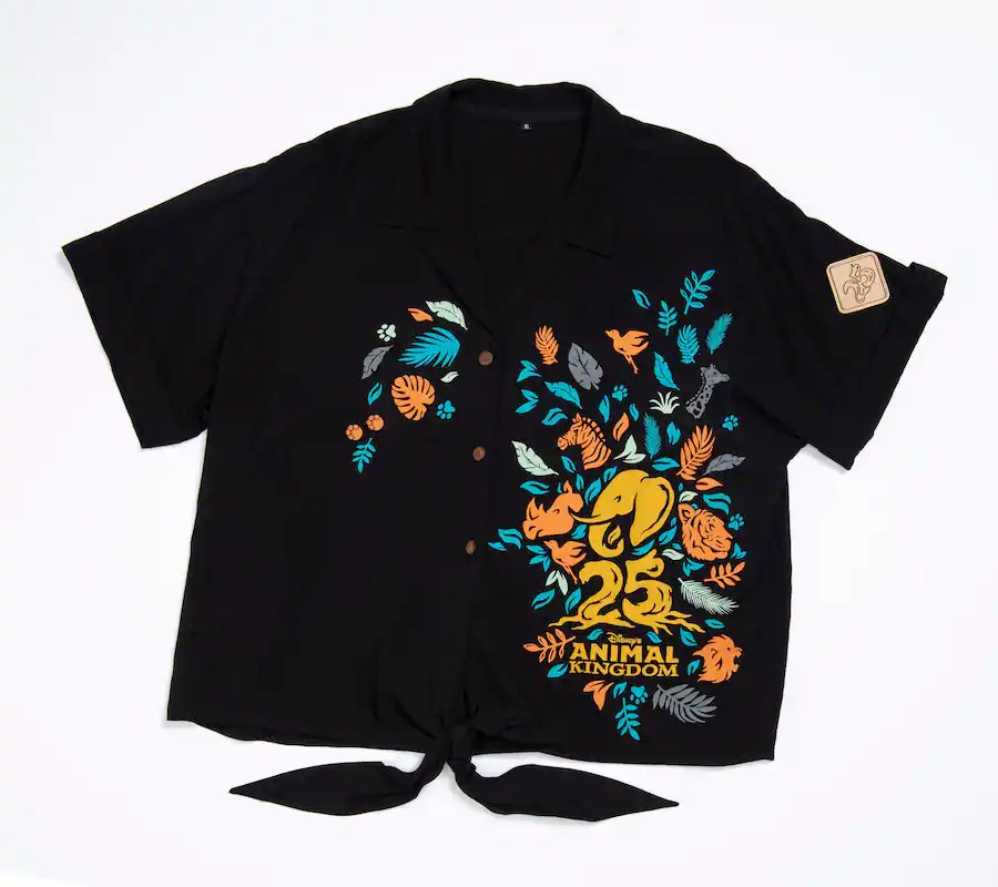 Other apparel options include a yellow button up with a wavy stripped pattern and the Animal Kingdom logo on one sleeve. Another button up in black is also available with a colorful artwork on the front featuring the Animal Kingdom 25th Anniversary logo in yellow with an elephant and colorful leaves all around.
