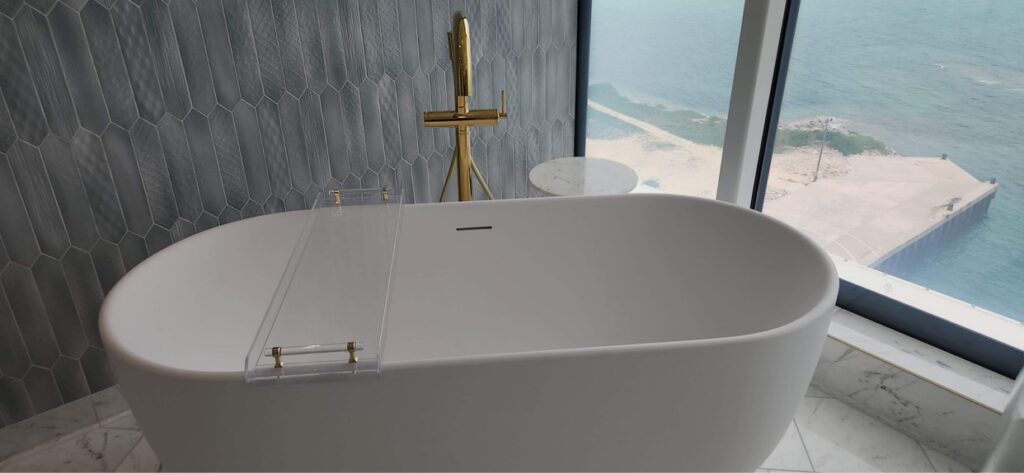 There are 2 main bathrooms with double sinks, stand-alone bathtubs and walk-in rain showers. The children’s room has its own bathroom with a shower. The library/bedroom area on Deck 14 has a full bathroom with double sinks and a shower. There is also a guest bathroom at the entry.